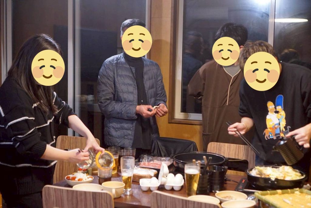 グランピング施設では、木々に囲まれたドーム型テントでゆったりと過ごし、みんなで協力して作ったすき焼きの夕食が最高の思い出に。具材を切ったり味を調えたりと、それぞれが自然に役割を分担しながら一体感を育み、まるで年末年始のような温かな雰囲気に包まれました。夜はボードゲームや部屋飲みを楽しみつつ、お酒を片手に語らう時間もあり、まさに“癒しと絆”をテーマにした大人のグランピング旅行となりました。